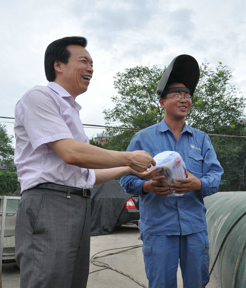 7月12日上午,縣委副書記、縣長孫云耀,縣委副書記孟柏干等縣領(lǐng)導(dǎo)冒著高溫到獨山DN1000自應(yīng)力管改造現(xiàn)場慰問供水公司一線職工,向供水管道安裝人員表示慰問,并送上防暑慰問品,叮囑大家繼續(xù)堅守崗位,科學(xué)安排工作,合理調(diào)整作業(yè)時間,切實做好防暑降溫工作。集團公司董事長倪阿泉等有關(guān)領(lǐng)導(dǎo)陪同慰問。