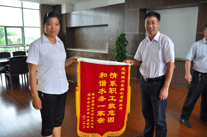 8月17日上午,柯西分公司職工莫煜君在分公司經(jīng)理田長(zhǎng)榮及其所在村村支書的陪同下來(lái)到公司送上一面“情系職工救危困,和諧水務(wù)一家親”的錦旗,感謝公司對(duì)她的關(guān)愛和幫助。