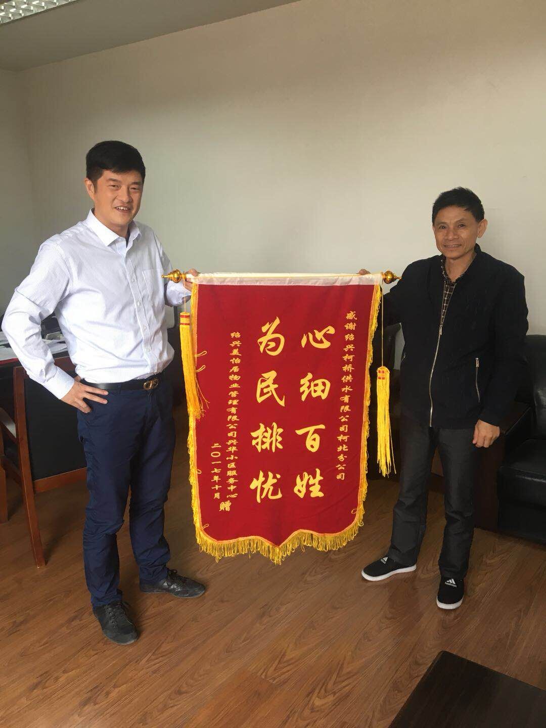 10月24日,華舍街道紹興美怡居物業管理有限公司興華小區服務中心負責人專程送來錦旗,感謝柯北分公司向他們提供優質高效的服務。